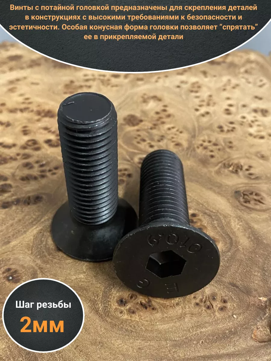 Винты с потайной головкой предназначены для скрепления деталей в конструкциях с высокими требованиями к безопасности и эстетичности. Особая конусная форма головки позволяет “спрятать” ее в прикрепляемой детали. При этом поверхность головки находится в одной плоскости с поверхностью детали. Крепёж с такими свойствами высоко востребован в машино-, автомобилестроении, при сборке бытовой техники, в приборостроении. Конструкция винта DIN 7991 включает стержень с метрической резьбой, потайную головку и шестигранное углубление под ключ для передачи крепежному изделию крутящего момента. Шестигранный внутренний диаметр углубления дает возможность подавать гораздо большее усилие при установке в контакте с ключом или битой. Винты DIN 7991 могут изготавливаться из углеродистых и легированных сталей