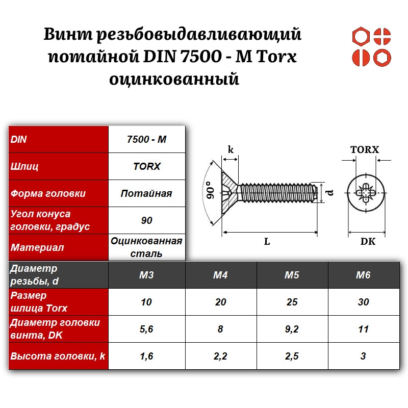 Винт резьбовыдавливающий потайной DIN 7500 М Torx М5х10 оцинкованный, 1000 шт.