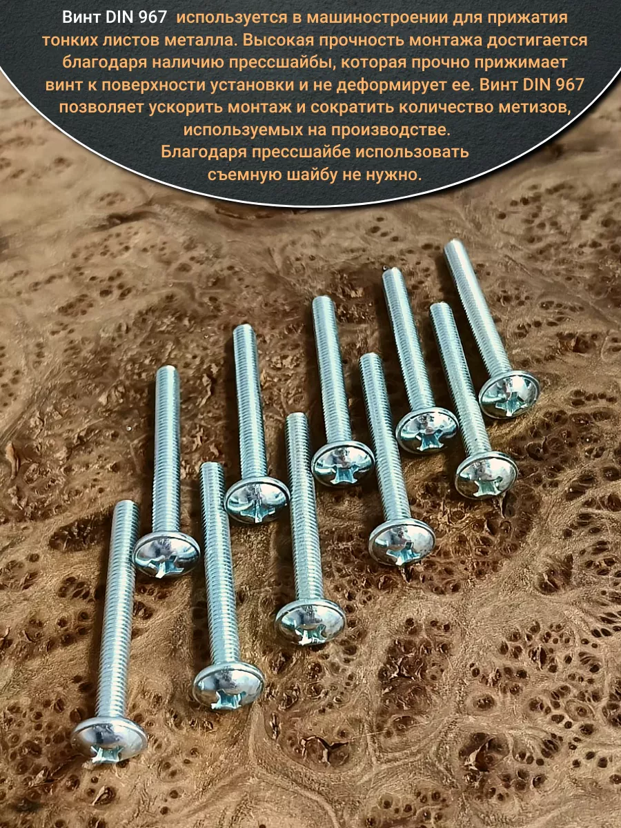 Винт мебельный DIN 967 — это универсальное крепежное изделие в виде стержня с наружной резьбой, выполненной по всей длиннее. Головка крепежа в виде полусферы с широкими полями, на головки имеются пазы под крестовую отвертку. При проведении монтажа можно использовать как PZ, так и SL отвертки или насадки, что делает крепеж универсальным.