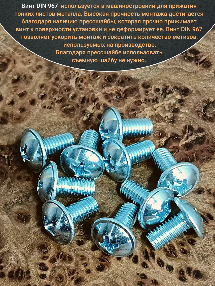 Винт мебельный DIN 967 — это универсальное крепежное изделие в виде стержня с наружной резьбой, выполненной по всей длиннее. Головка крепежа в виде полусферы с широкими полями, на головки имеются пазы под крестовую отвертку. При проведении монтажа можно использовать как PZ, так и SL отвертки или насадки, что делает крепеж универсальным.