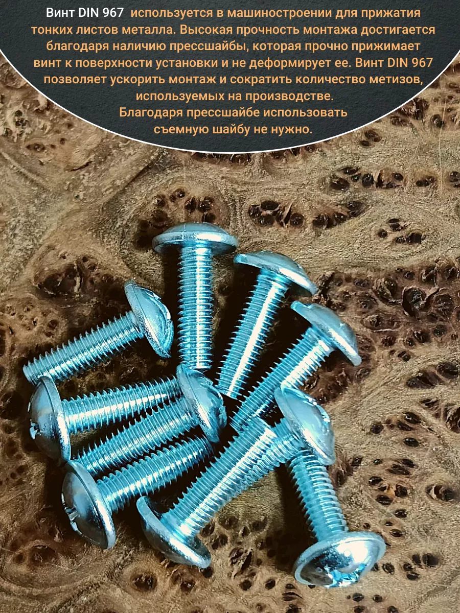 Винт мебельный с полукруглой головкой и прессшайбой, применяется при строительных работах, в машиностроении. Используется для монтажа из металла, пластика и древесины твердых пород. Монтаж производится в заранее подготовленное отверстие с применением гайки соответствующего диаметра, или применятся для вкручивания в различные резьбовые отверстия при монтаже. Винт мебельный DIN 967 — это универсальное крепежное изделие в виде стержня с наружной резьбой, выполненной по всей длинне. Головка крепежа в виде полусферы с широкими полями, на головке имеются пазы под крестовую отвертку. При проведении монтажа можно использовать как PZ, так и SL отвертки или насадки, что делает крепеж универсальным.