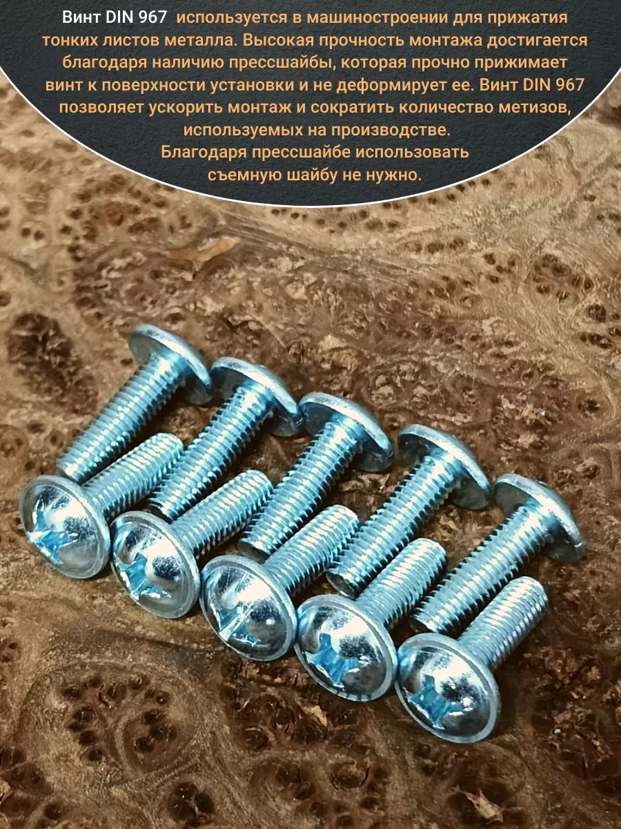 Винт мебельный DIN 967 — это универсальное крепежное изделие в виде стержня с наружной резьбой, выполненной по всей длиннее. Головка крепежа в виде полусферы с широкими полями, на головки имеются пазы под крестовую отвертку. При проведении монтажа можно использовать как PZ, так и SL отвертки или насадки, что делает крепеж универсальным.
