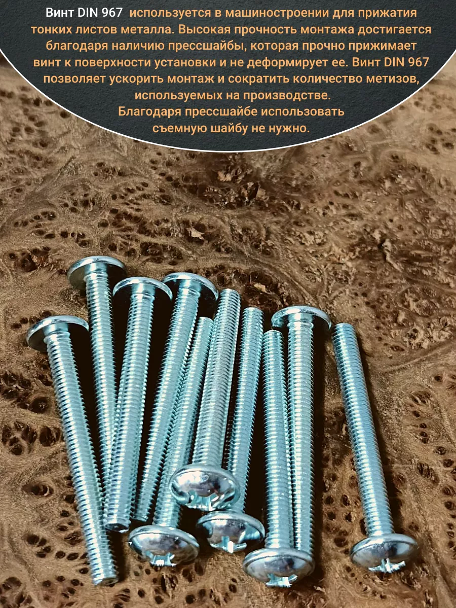 Винт мебельный с полукруглой головкой и прессшайбой, применяется при строительных работах, в машиностроении. Используется для монтажа из металла, пластика и древесины твердых пород. Монтаж производится в заранее подготовленное отверстие с применением гайки соответствующего диаметра, или применятся для вкручивания в различные резьбовые отверстия при монтаже. Винт мебельный DIN 967 — это универсальное крепежное изделие в виде стержня с наружной резьбой, выполненной по всей длинне. Головка крепежа в виде полусферы с широкими полями, на головке имеются пазы под крестовую отвертку. При проведении монтажа можно использовать как PZ, так и SL отвертки или насадки, что делает крепеж универсальным.