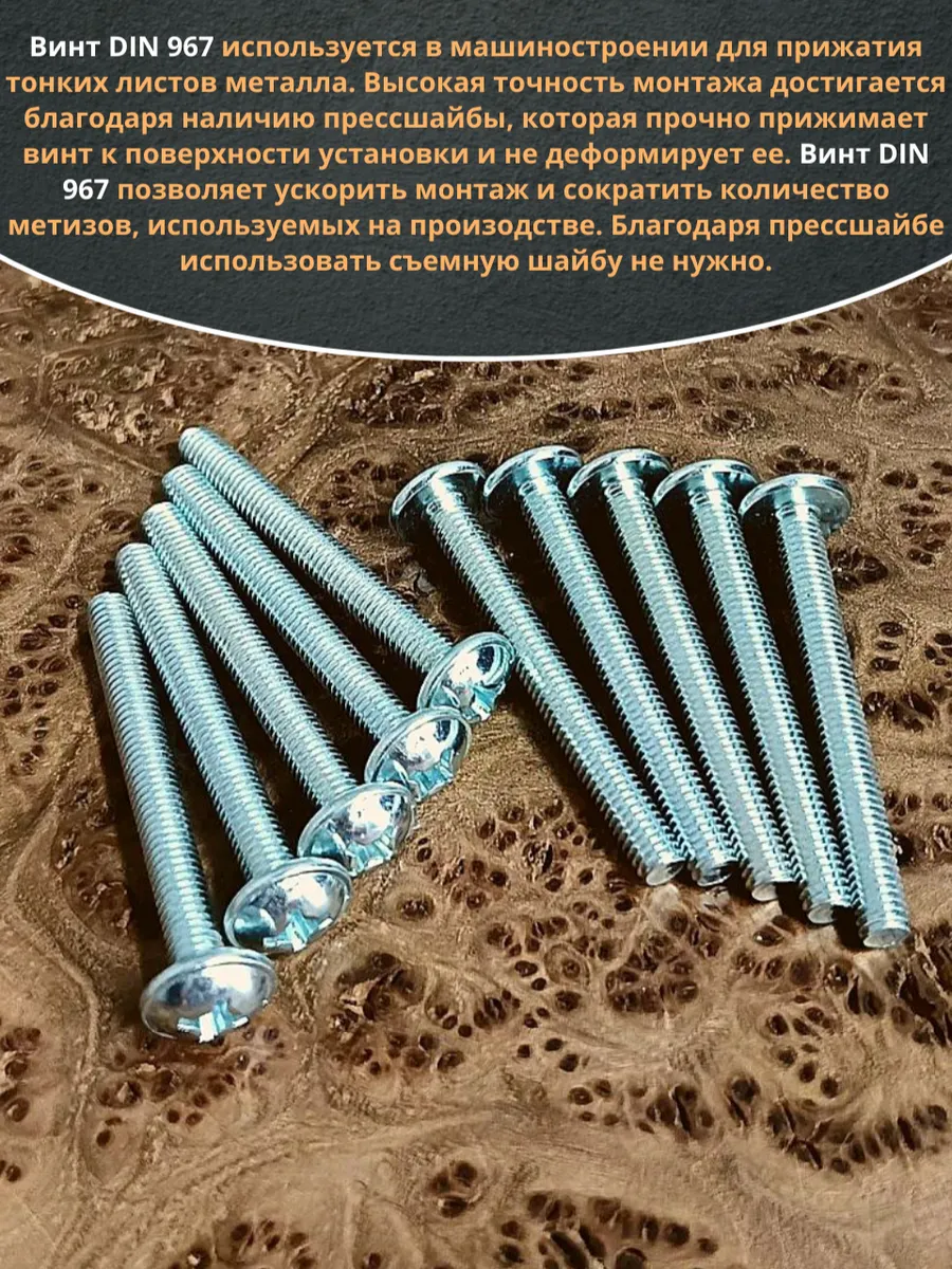 Винт мебельный с полукруглой головкой и прессшайбой, применяется при строительных работах, в машиностроении. Используется для монтажа из металла, пластика и древесины твердых пород. Монтаж производится в заранее подготовленное отверстие с применением гайки соответствующего диаметра, или применятся для вкручивания в различные резьбовые отверстия при монтаже. Винт мебельный DIN 967 — это универсальное крепежное изделие в виде стержня с наружной резьбой, выполненной по всей длинне. Головка крепежа в виде полусферы с широкими полями, на головке имеются пазы под крестовую отвертку. При проведении монтажа можно использовать как PZ, так и SL отвертки или насадки, что делает крепеж универсальным.