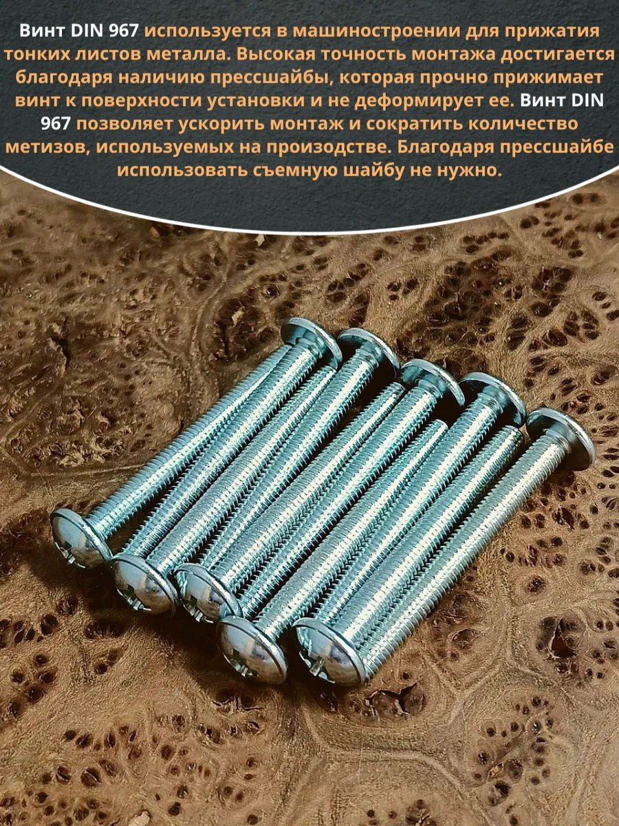 Винт мебельный с полукруглой головкой и прессшайбой, применяется при строительных работах, в машиностроении. Используется для монтажа из металла, пластика и древесины твердых пород. Монтаж производится в заранее подготовленное отверстие с применением гайки соответствующего диаметра, или применятся для вкручивания в различные резьбовые отверстия при монтаже. Винт мебельный DIN 967 — это универсальное крепежное изделие в виде стержня с наружной резьбой, выполненной по всей длинне. Головка крепежа в виде полусферы с широкими полями, на головке имеются пазы под крестовую отвертку. При проведении монтажа можно использовать как PZ, так и SL отвертки или насадки, что делает крепеж универсальным.