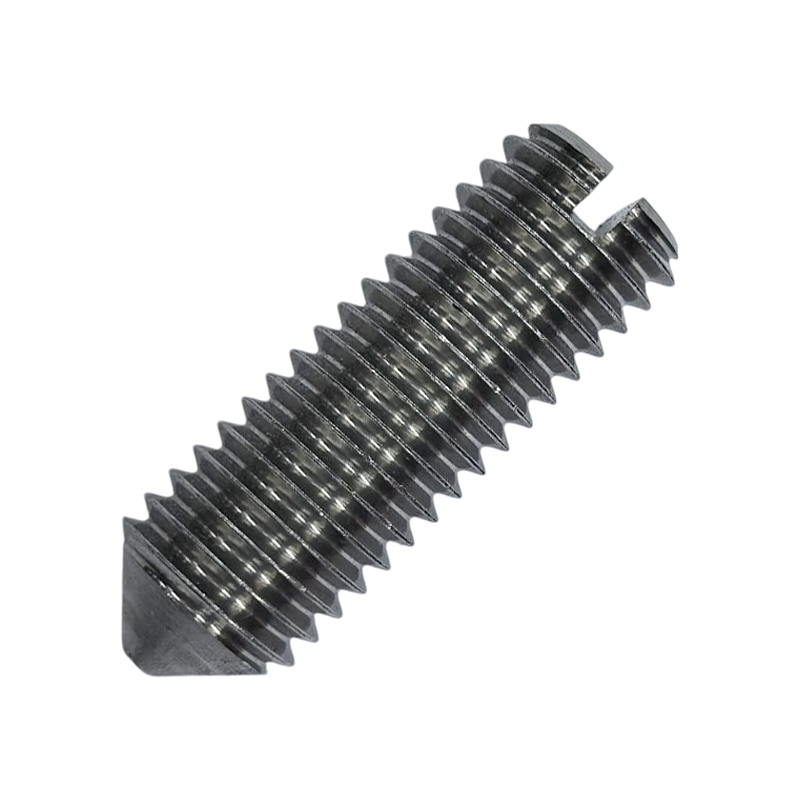 Стопорный винт с коническим концом и прямым шлицем предназначен для создания соединений, которые не работают на растяжение. Он широко используется в машиностроении и приборостроении для фиксации шестерёнок, подшипников, колец, втулок на валах.