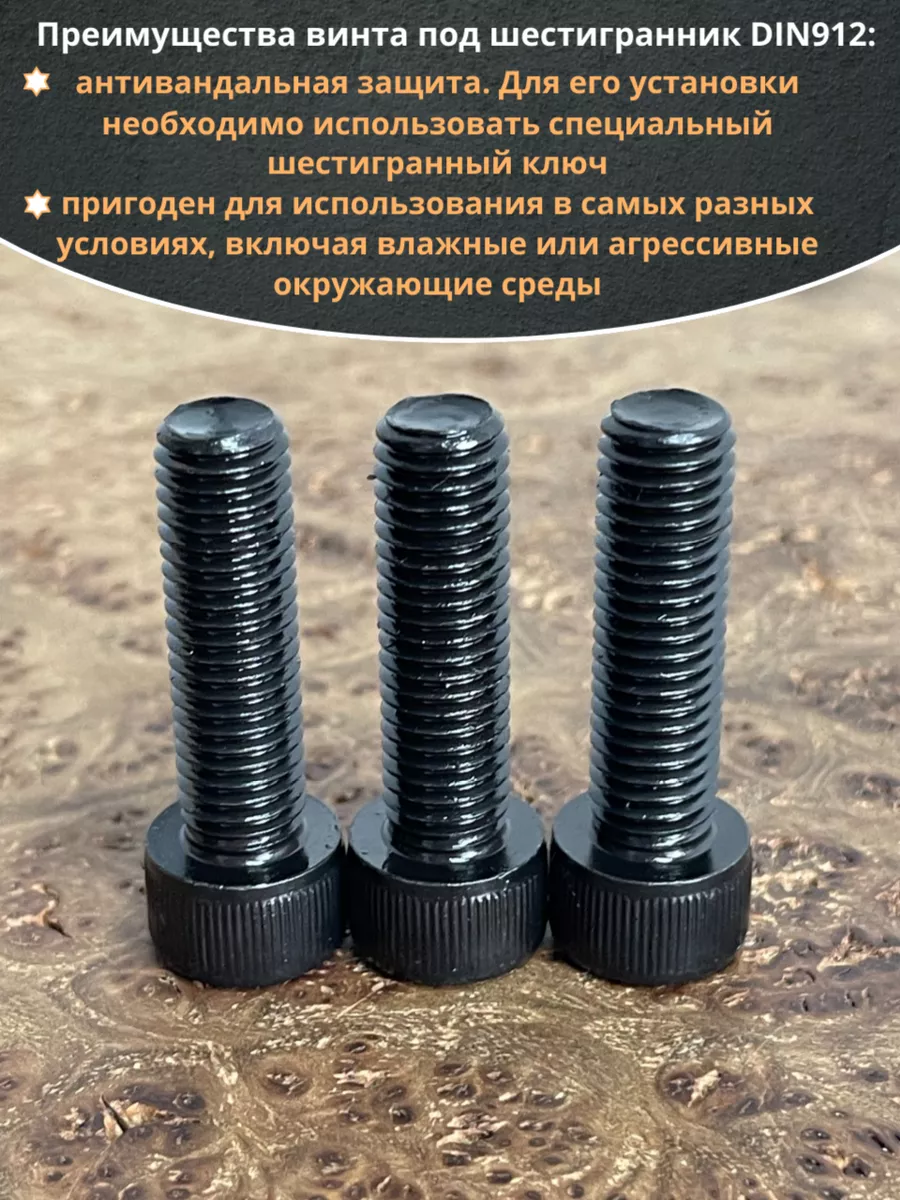 Винт имеет высокую цилиндрическую головку, предназначен для установки его с углублением в отверстие. Закручивается винт при помощи ключа-шестигранника. Высокопрочный винт DIN 912 обеспечивает надежное скрепление узлов и деталей в монтажных и других видах работ. Он имеет головку цилиндрической формы с углублением под соответствующий шестигранный ключ.