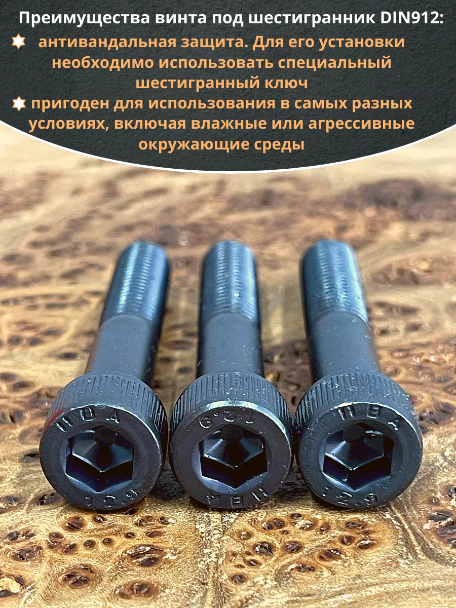 Винт имеет высокую цилиндрическую головку, предназначен для установки его с углублением в отверстие. Закручивается винт при помощи ключа-шестигранника. Высокопрочный винт DIN 912 обеспечивает надежное скрепление узлов и деталей в монтажных и других видах работ. Он имеет головку цилиндрической формы с углублением под соответствующий шестигранный ключ.