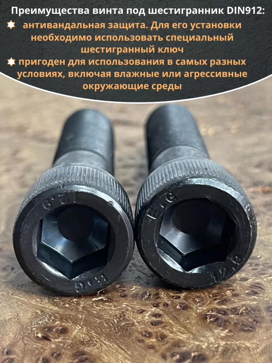 Винт имеет высокую цилиндрическую головку, предназначен для установки его с углублением в отверстие. Закручивается винт при помощи ключа-шестигранника. Высокопрочный винт DIN 912 обеспечивает надежное скрепление узлов и деталей в монтажных и других видах работ. Он имеет головку цилиндрической формы с углублением под соответствующий шестигранный ключ.