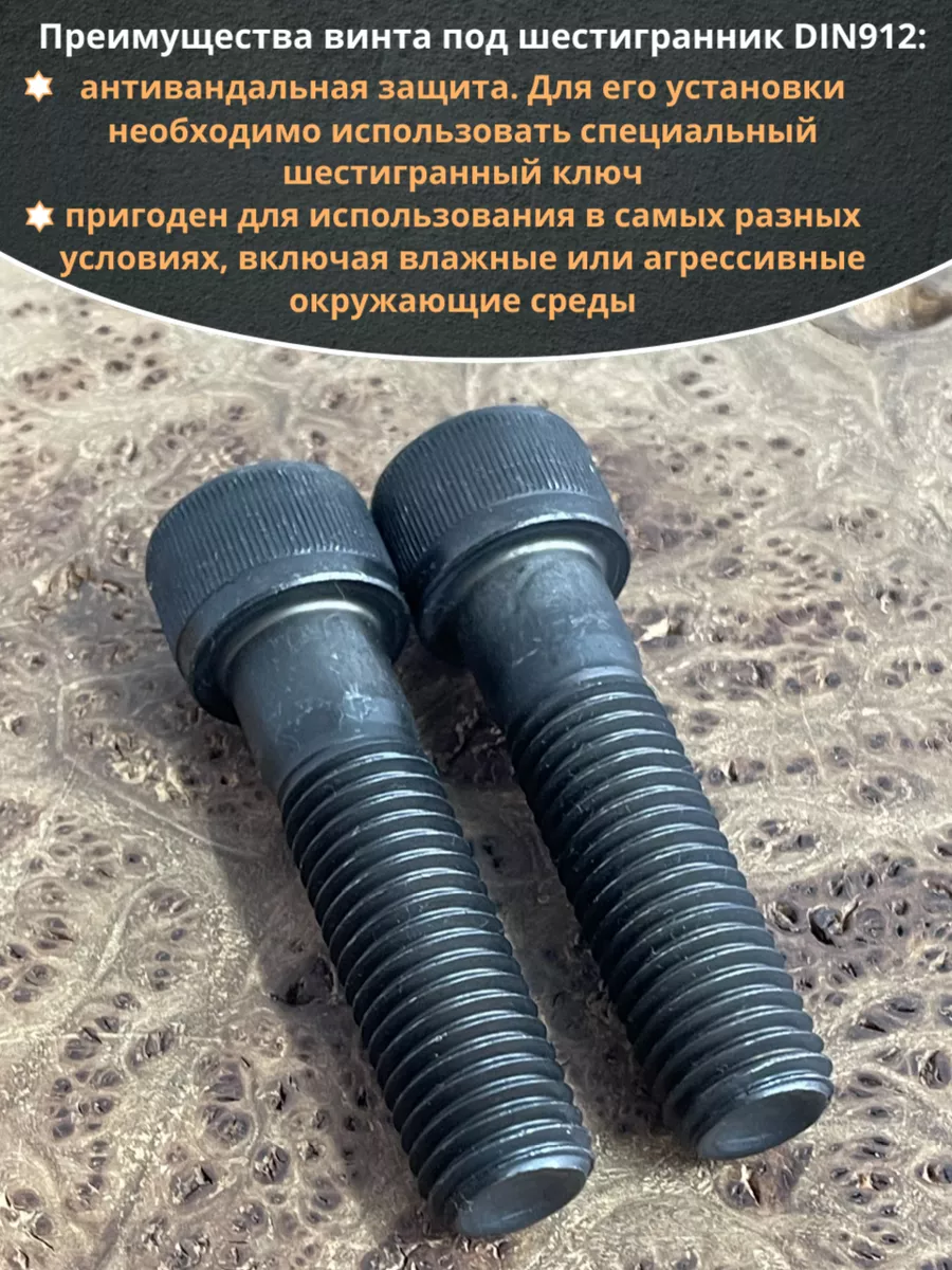 Винт имеет высокую цилиндрическую головку, предназначен для установки его с углублением в отверстие. Закручивается винт при помощи ключа-шестигранника. Высокопрочный винт DIN 912 обеспечивает надежное скрепление узлов и деталей в монтажных и других видах работ. Он имеет головку цилиндрической формы с углублением под соответствующий шестигранный ключ.