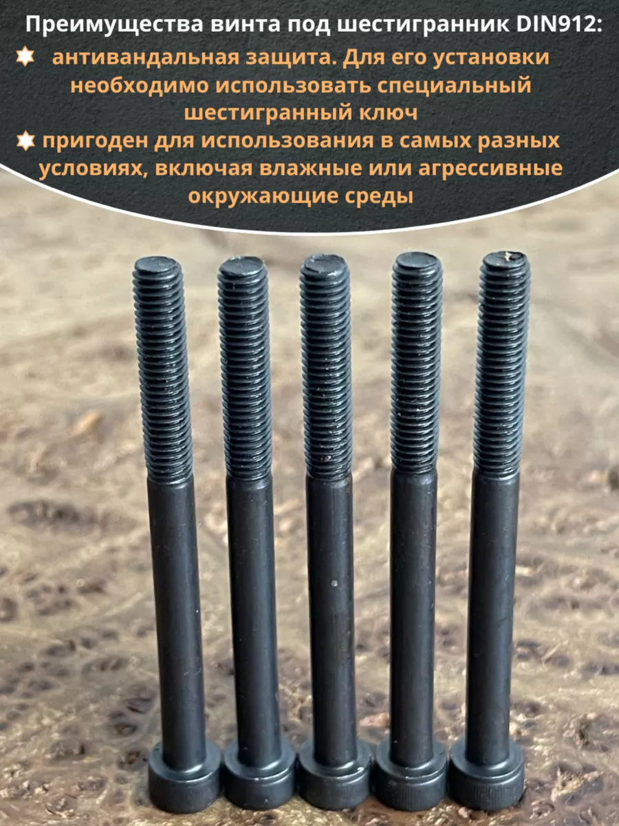 Винт имеет высокую цилиндрическую головку, предназначен для установки его с углублением в отверстие. Закручивается винт при помощи ключа-шестигранника. Высокопрочный винт DIN 912 обеспечивает надежное скрепление узлов и деталей в монтажных и других видах работ. Он имеет головку цилиндрической формы с углублением под соответствующий шестигранный ключ.