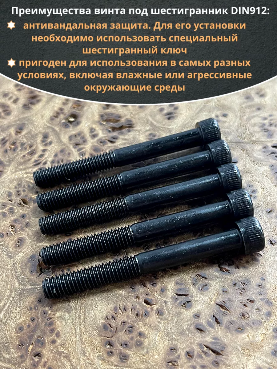 Винт имеет высокую цилиндрическую головку, предназначен для установки его с углублением в отверстие. Закручивается винт при помощи ключа-шестигранника. Высокопрочный винт DIN 912 обеспечивает надежное скрепление узлов и деталей в монтажных и других видах работ. Он имеет головку цилиндрической формы с углублением под соответствующий шестигранный ключ.