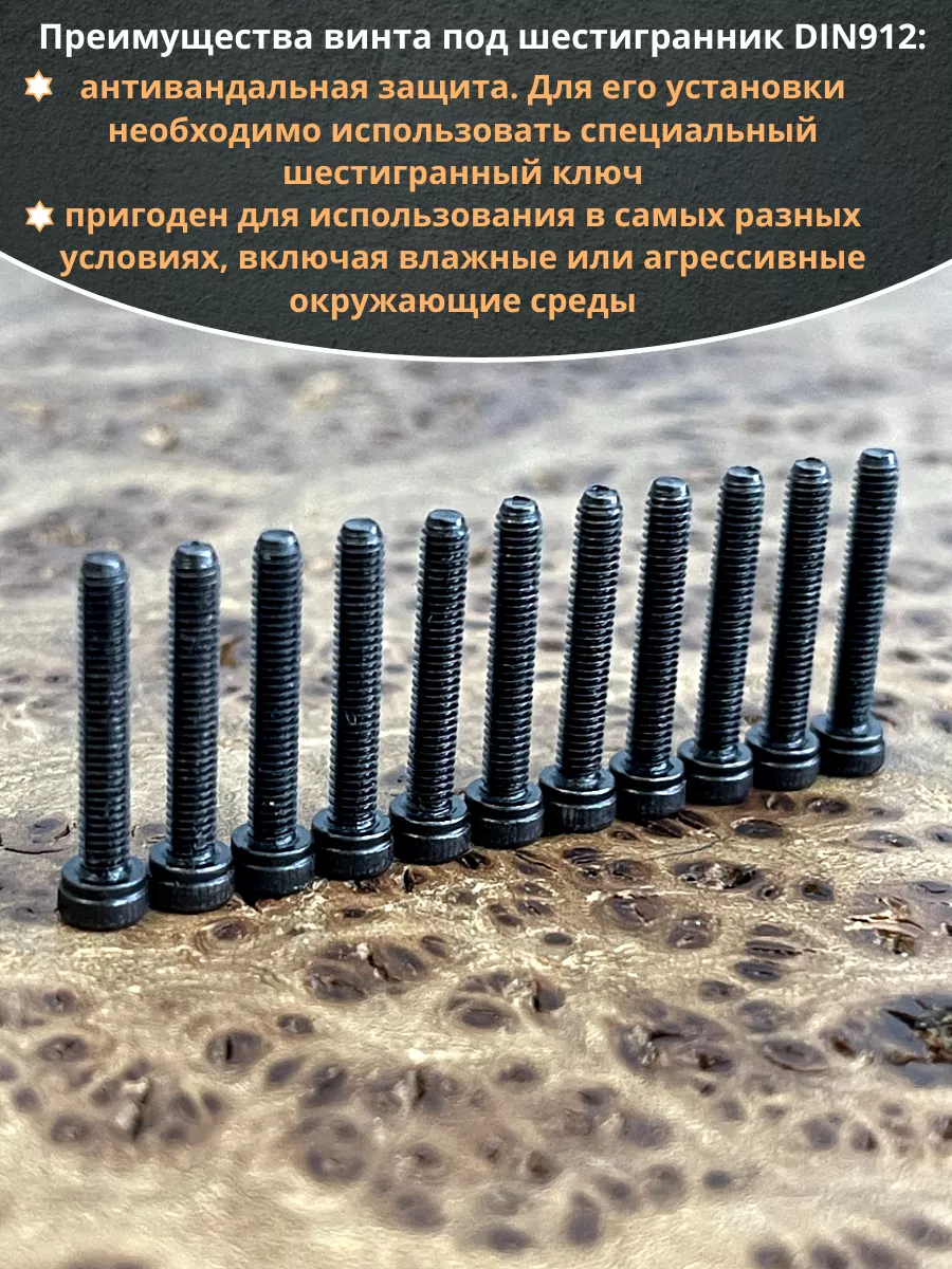 Винт имеет высокую цилиндрическую головку, предназначен для установки его с углублением в отверстие. Закручивается винт при помощи ключа-шестигранника. Высокопрочный винт DIN 912 обеспечивает надежное скрепление узлов и деталей в монтажных и других видах работ. Он имеет головку цилиндрической формы с углублением под соответствующий шестигранный ключ.