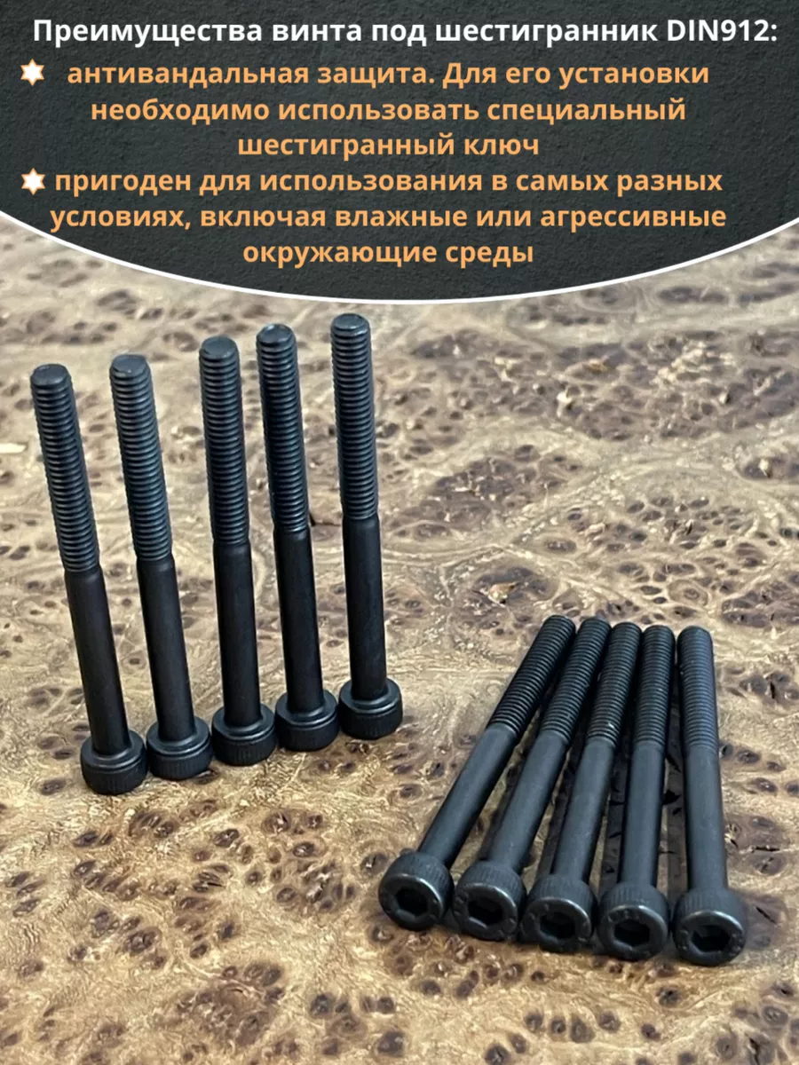 Винт имеет высокую цилиндрическую головку, предназначен для установки его с углублением в отверстие. Закручивается винт при помощи ключа-шестигранника. Высокопрочный винт DIN 912 обеспечивает надежное скрепление узлов и деталей в монтажных и других видах работ. Он имеет головку цилиндрической формы с углублением под соответствующий шестигранный ключ.