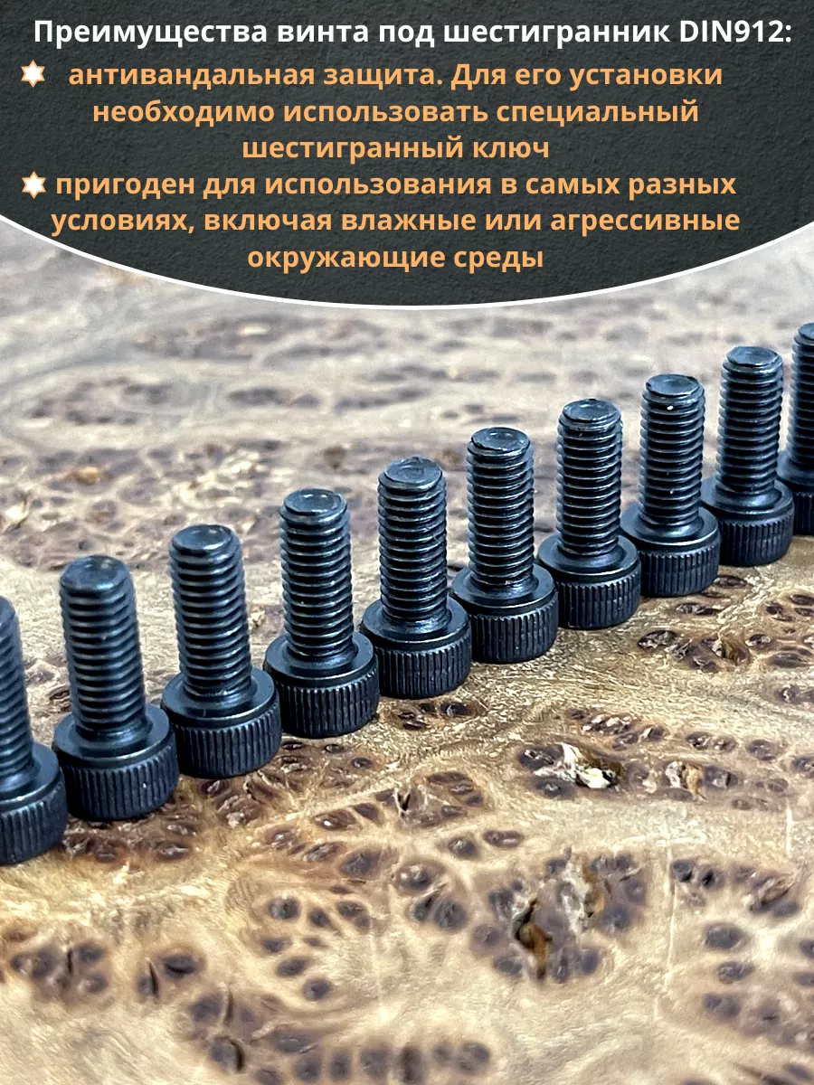 Винт имеет высокую цилиндрическую головку, предназначен для установки его с углублением в отверстие. Закручивается винт при помощи ключа-шестигранника. Высокопрочный винт DIN 912 обеспечивает надежное скрепление узлов и деталей в монтажных и других видах работ. Он имеет головку цилиндрической формы с углублением под соответствующий шестигранный ключ.