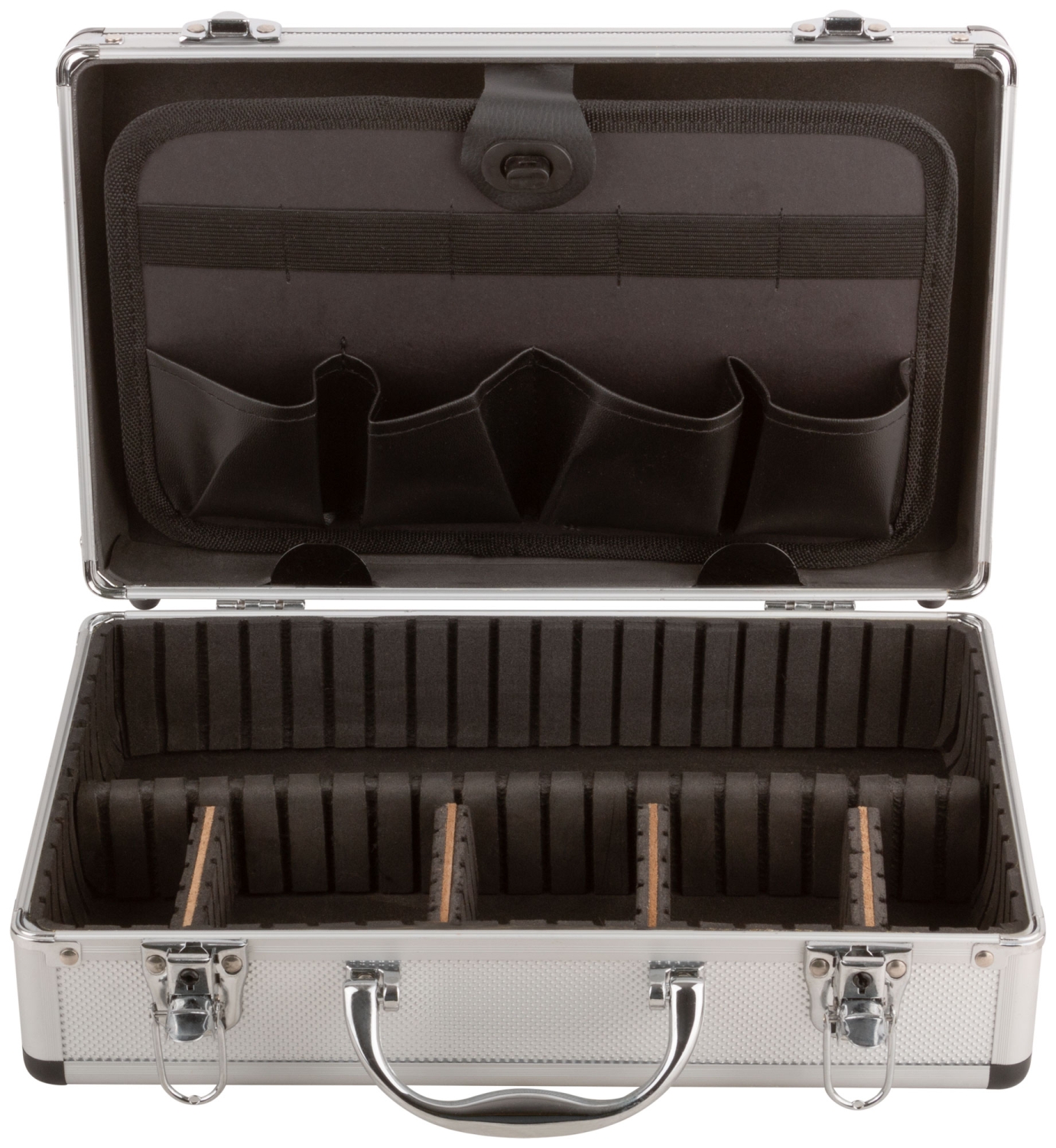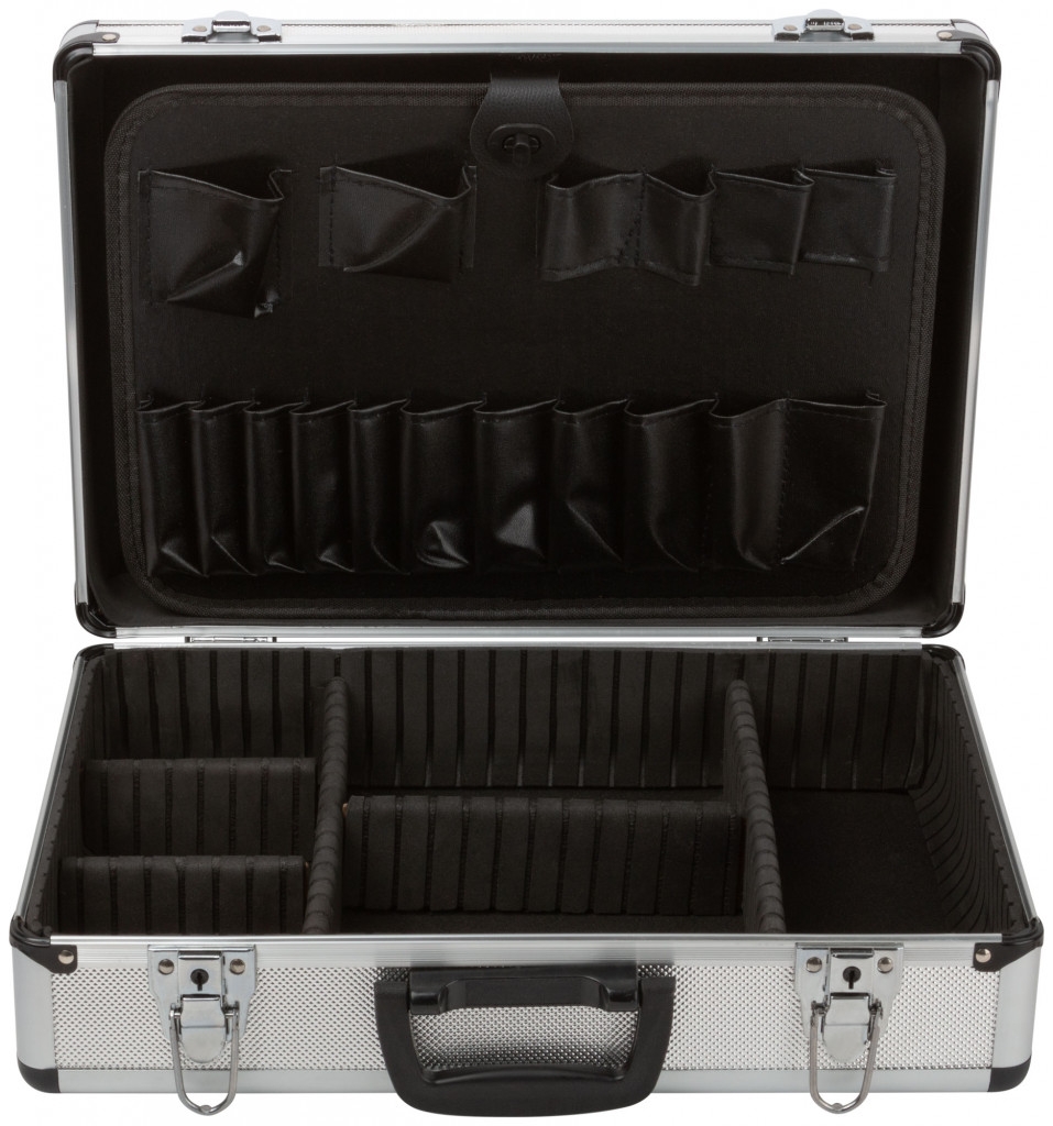 Ящик для инструмента алюминиевый 430х310х130 мм. Внутренние перегородки – переставные. Отделка из мягкого пористого материала для обеспечения более бережного хранения инструмента.