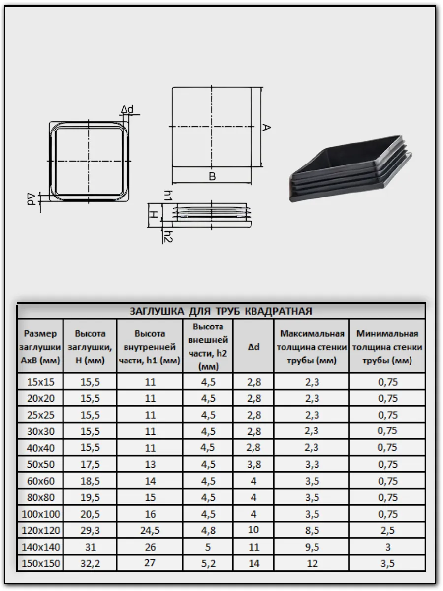 | Заглушка для труб квадратная 15х15 мм черная, 50 шт. | 26-0200ф50 | 1 шт. |