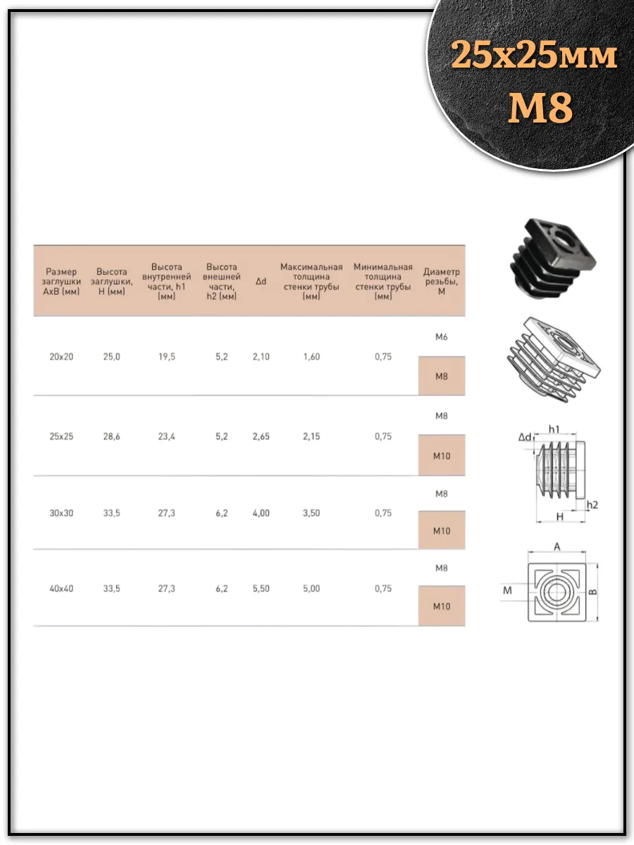 | Заглушка для труб квадратная 25х25 мм с резьбой М8, 4 шт. | 32-0110ф4 | 1 шт. |