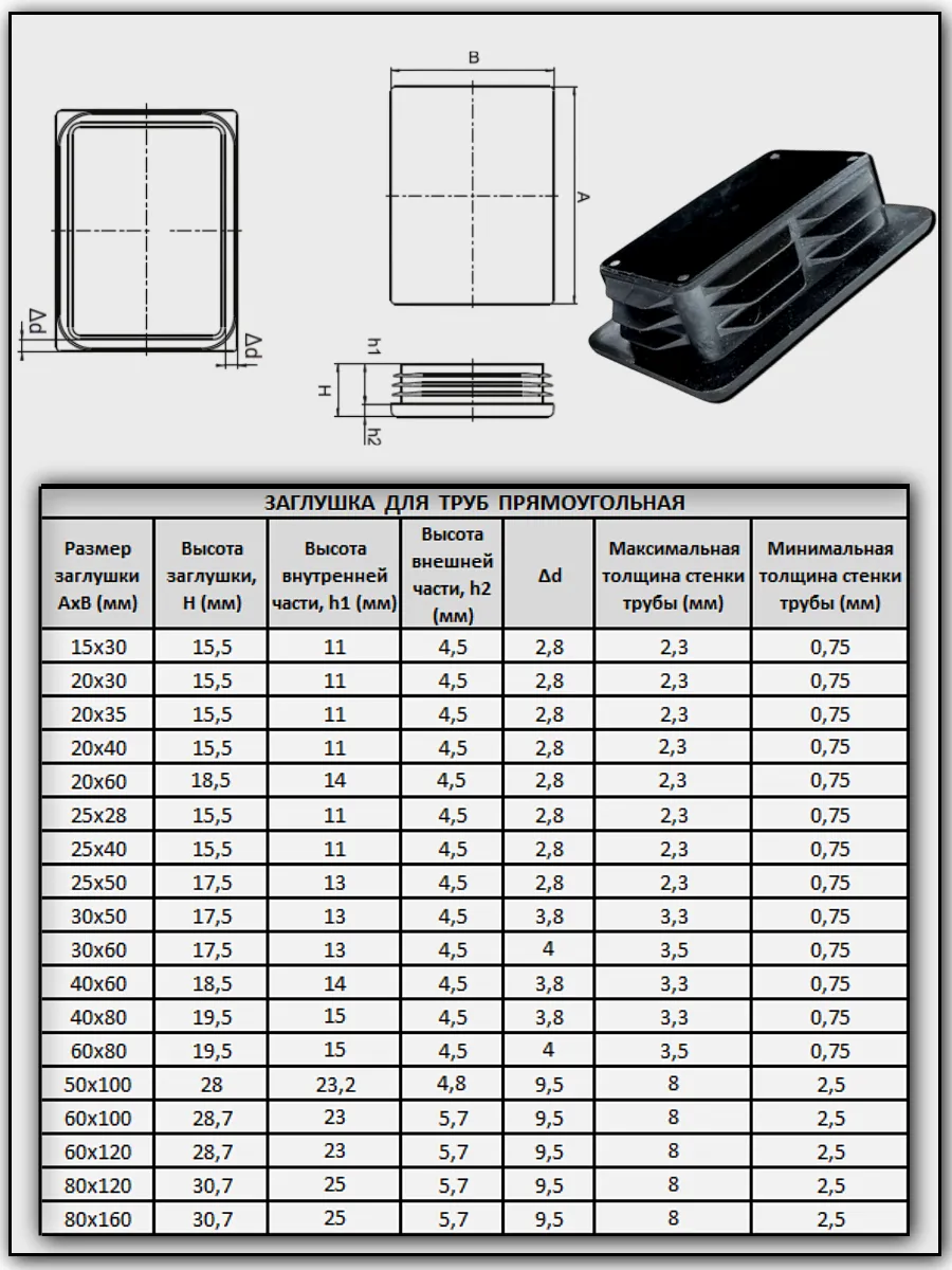 | Заглушка для труб прямоугольная 30х50 мм черная, 50 шт. | 26-0350ф50 | 1 шт. |