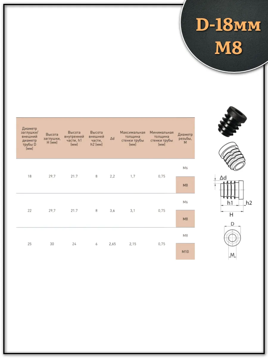 | Заглушка для труб с резьбой М8 круглая d 18 мм, 2 шт. | 32-0220ф2 | 1 шт. |