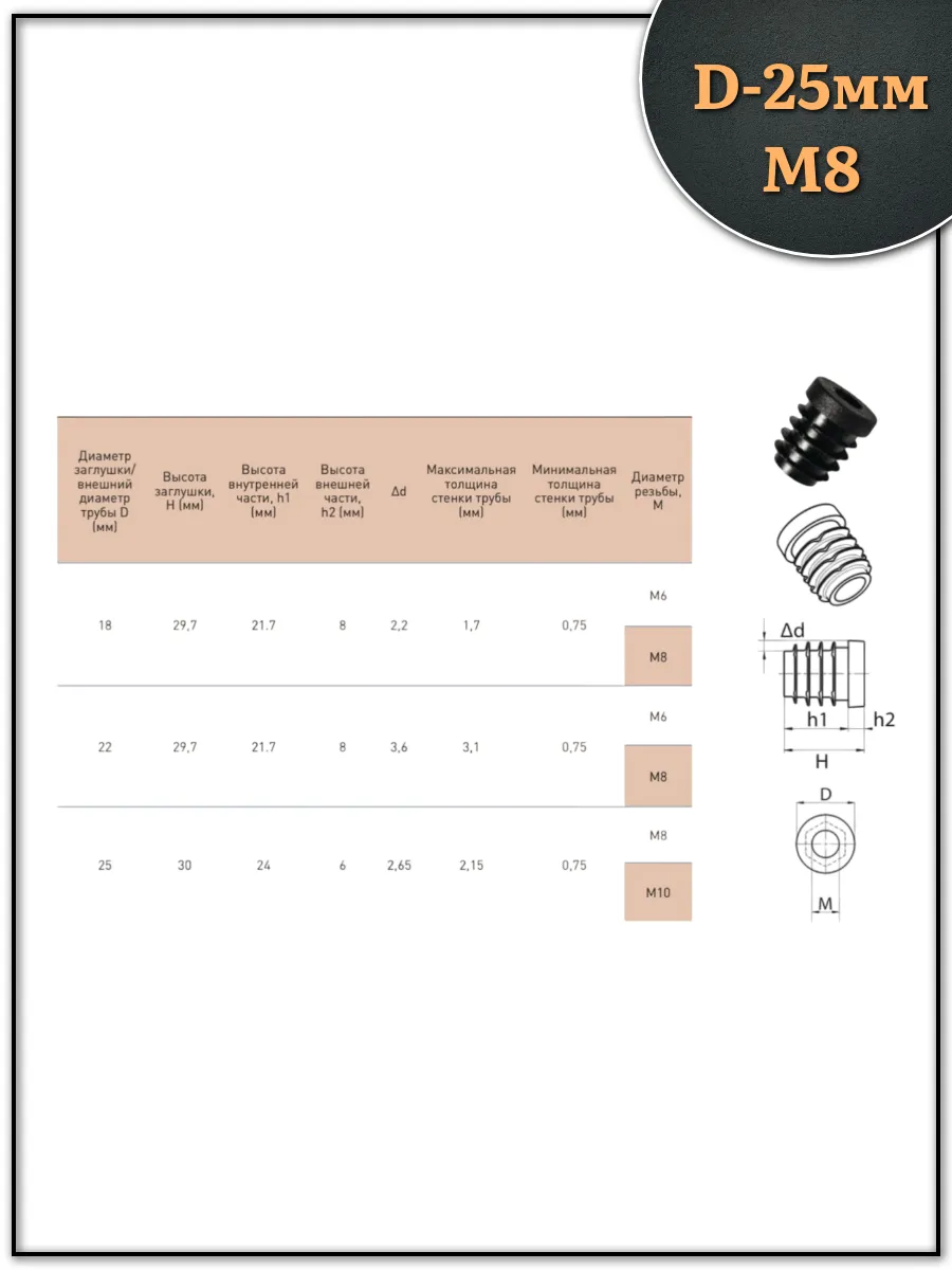 | Заглушка для труб с резьбой М8 круглая d 25 мм, 4 шт. | 32-0260ф4 | 1 шт. |
