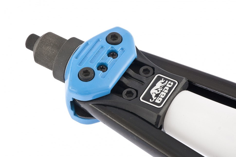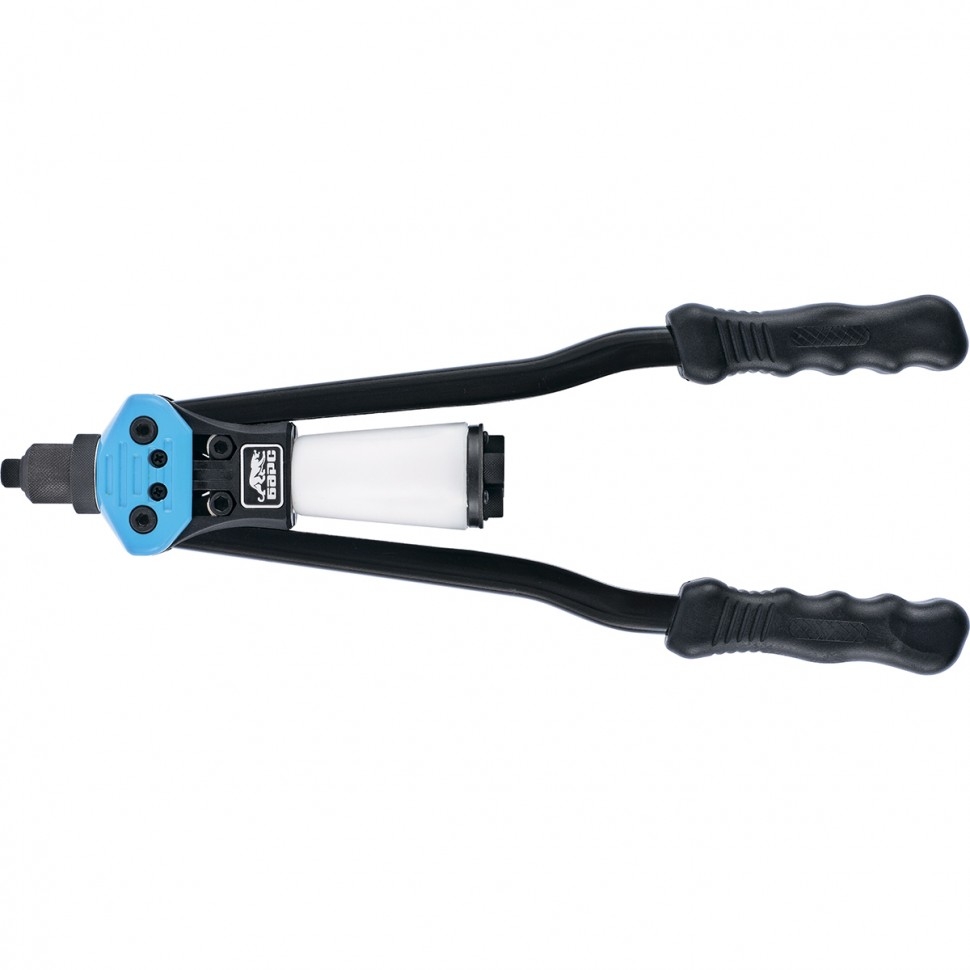 Двуручный заклёпочник Барс 40432 длиной 360 мм предназначен для работы с алюминиевыми и стальными заклёпками диаметром 2,4-6,4 мм. Предназначен для прочного соединения листовых металлических заготовок, легких конструкций небольшой толщины и металлопрофилей. Двуручный заклёпочник требует меньше усилий от оператора для вытягивания шпильки, поэтому подходит для профессионального применения и больших объемов работ. Заклёпочник отличается высоким ресурсом и коррозионной стойкостью, т.к. отлит из прочного алюминиевого сплава ADC12 под высоким давлением.