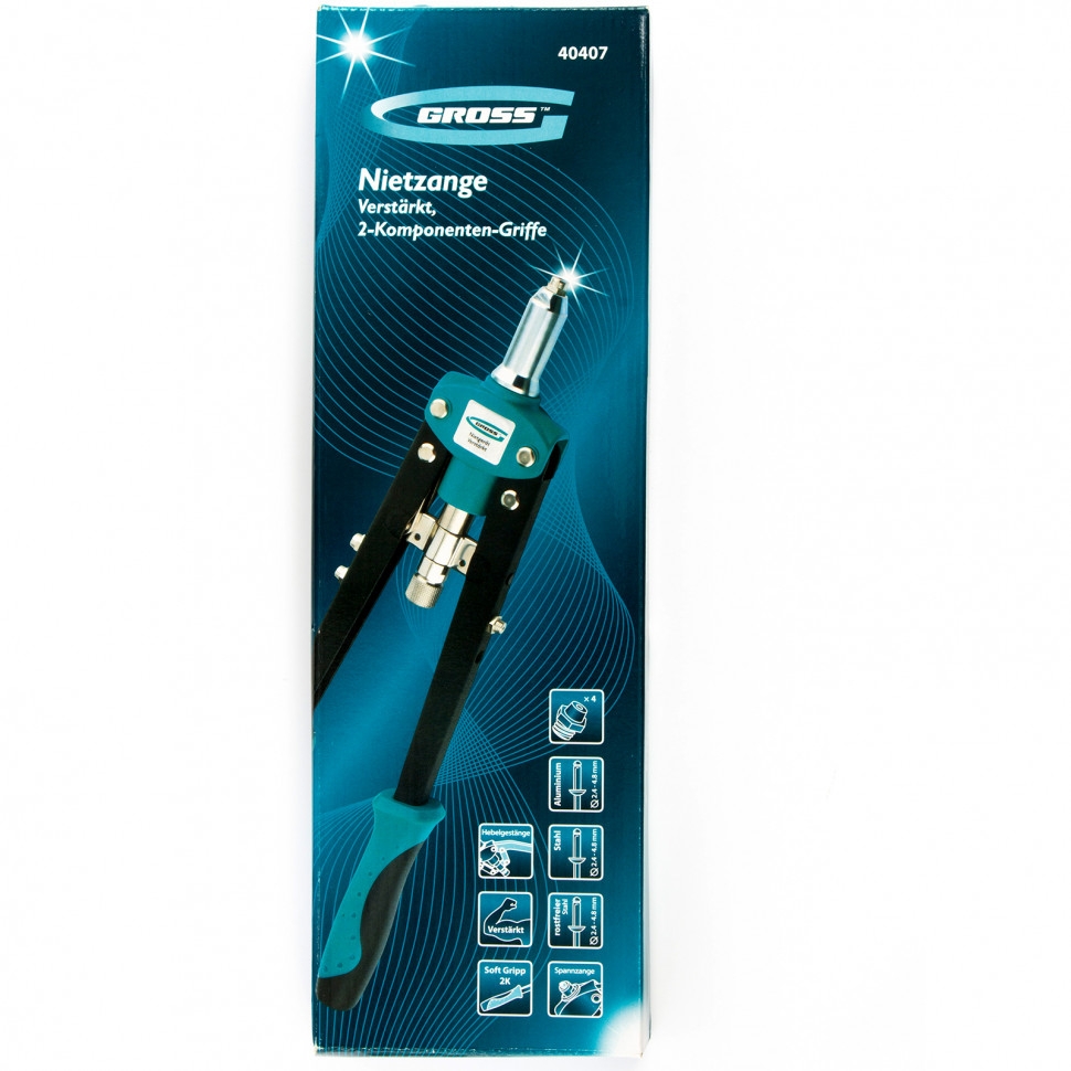 Заклёпочник двуручный Gross 40407 с двухкомпонентными рукоятками, 420 мм, предназначен для соединения листовых заготовок, металлопрофиля, легких строительных конструкций и плоских деталей. Применяется с алюминиевыми, стальными и нержавеющими заклёпками 2,4-3,2-4,0-4,8 мм, для которых предусмотрены сменные насадки. Заклёпочник используется при проведении строительных и ремонтных работ, в производстве мебели, бытовой и оргтехники, а также для ремонта автомобилей.